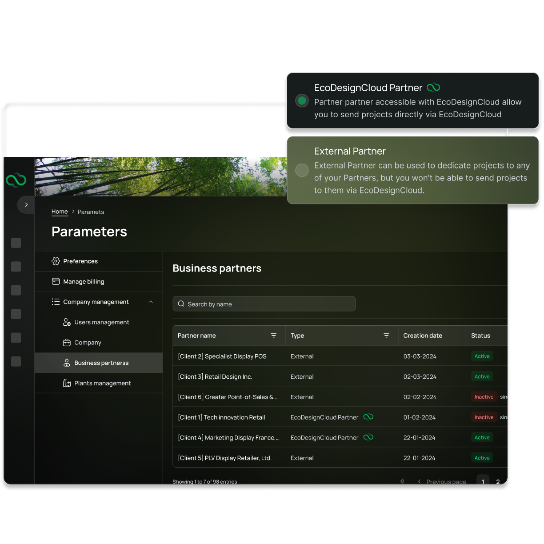 EcoDesignCloud enables you to easily create, collect and access qualitative and quantitative metrics with internal and external online reporting or in document format. Your sustainability data is compiled in one place, and can be instantly shared with all your team members, as well as external business partners (customers and suppliers).